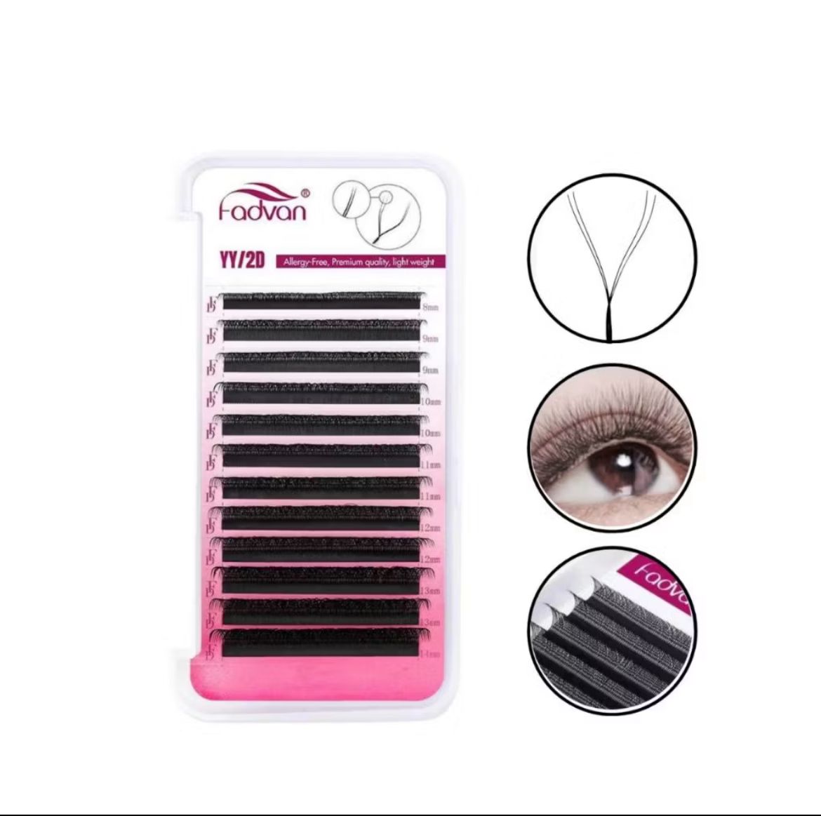Os cílios YY Fadvan, conhecidos popularmente como Volume Brasileiro, são produzidos com alta tecnologia e possuem um entrelaçamento de fios feitos em PBT deixando os fios muito leve, que não prejudica os fios naturais. Seu formato em Y permite a aplicação através da técnica fio a fio.
